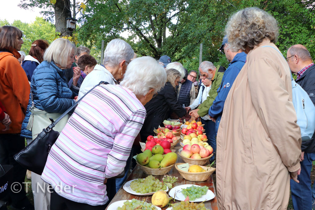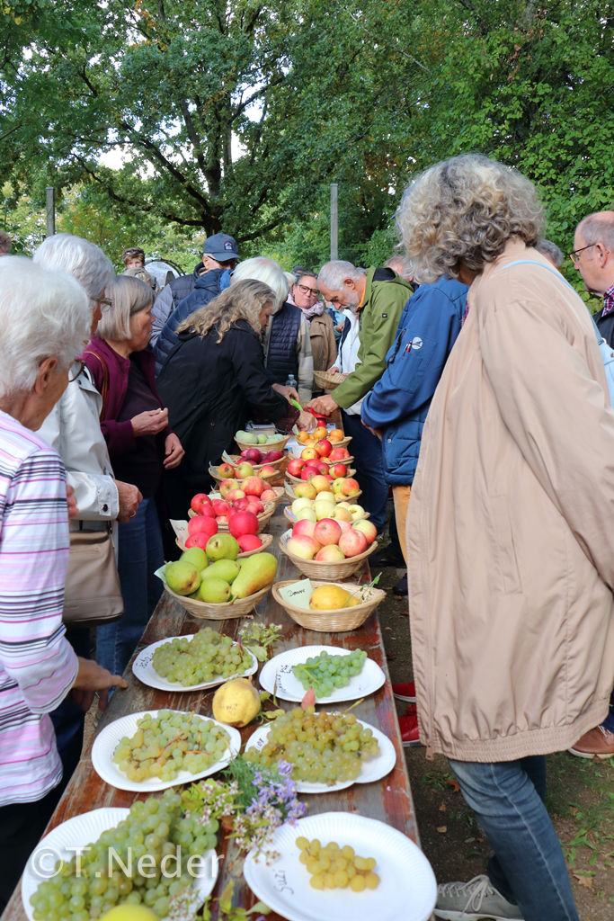 Neben knackigen Herbstäpfeln, Nashis, Saxonia Birnen und Indiana-Bananen hatte Geschäftsführer Thomas Neder zusammen mit Wolfgang Kalb 15 unterschiedliche Rebsorten in Grün, Gelb, Rosé und in Rot aufgetischt. So gab es für die Gartenfreunde richtig viel zu naschen und in einem facettenreichen Verkostungsmarathon zu testen.